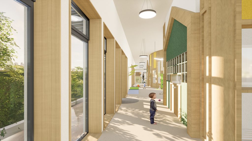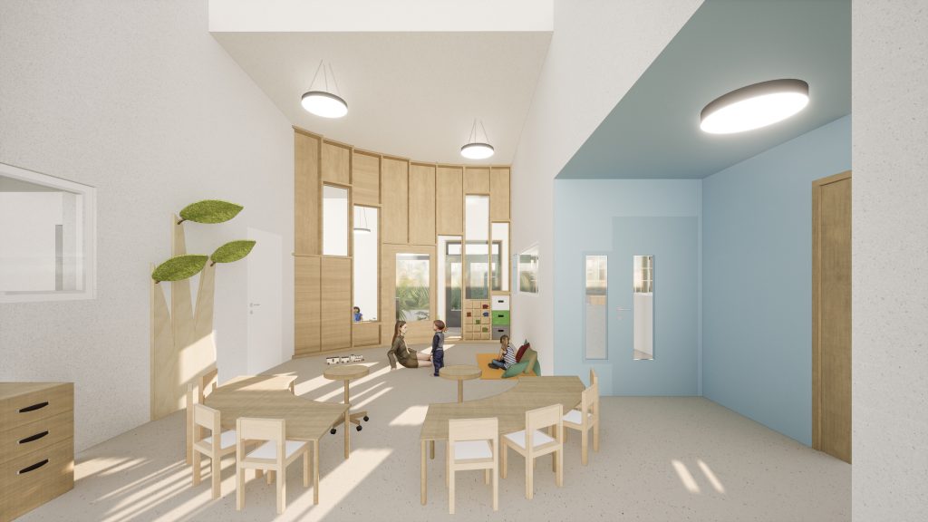 Programme / locaux : construction d’une crèche collective de 48 berceaux. Le bâtiment est un volume qui se décline de plain-pied avec une alternance de toitures terrasses et de toiture en zinc avec l’émergence de sheds assurant la ventilation passive et un éclairage naturel du projet.